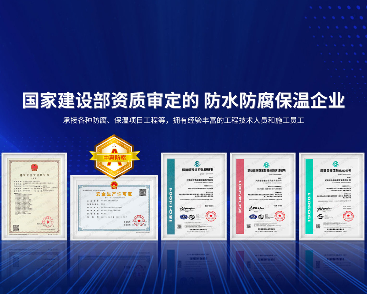 公司經營范圍:防水防腐保溫工程;消防設施工程;建筑裝修裝飾工程;建筑機電安裝工程;電力工程;建筑工程;石油化工工程;工業清洗工程;油罐清洗工程;鋼結構工程;環保工程;模板腳手架工程;電纜防火封堵、防污閃噴涂、外墻外保溫工程;各類施工勞務作業;設備維修、船舶鉚焊、涂裝;電力工程材料、建材、防水材料、防火材料、防腐保溫材料銷售,并相繼通過了GB/T19001-2008idtISO9001:2008GB/T50430-2007質量管理體系認證證書。GB/T24001-2004idtISO14001:2004環境管理體系認證證書。GB/T28001-2011idtOHSAS18001:2007職業健康安全管理體系認證證書。公司是中國防腐蝕于防護協會、中國施工企業管理協會、電力協會和中國鋼結構防水協會會員單位。 公司的經營業務涵蓋了石油、化工、電力、冶金、煤炭、船舶、國防、燃氣、水利、環保、交通運輸、航空及國防軍工和輕紡市政等行業的防腐保溫絕熱設備。鋼結構安裝、防火、防水、金屬噴鍍、聚脲噴繪、陰極保護、防滲透堵漏、玻璃鋼及各種磚版材料襯里、橡膠襯里、煙氣硫和耐酸溶劑腐蝕等工程施工。公司連續十年榮獲“省市先進施工企業”“安全生產先進單位”“重合同,守信用企業”和“AA***資質企業”的稱號。2000年被命名為市級文明單位,2002年被國家工商行政管理局命名為“重合同,守信用的企業”、被中國工業防腐蝕技術協會命名為“防腐蝕企業,能源節約及環境保護領域有豐富的經驗和***的業績。工程一次交驗合格率100%。其中攀枝花鋼鐵公司煉鐵廠四號高爐及熱風爐防腐工程、上海寶鋼公司煤氣柜防腐工程、撫順石油一廠裝置防腐項目、齊魯石化公司稀烴廠高塔防腐工程、吉林化學工業公司煉油廠油罐防腐工程、天津石化熱電廠六號爐頂棚聯絡管保溫工程、大慶油田(太倉)力神泵業工程、中國化學工程第十一建設工程、中原油田勘探局工程、中國石化銷售有限公司華北分部、魯皖輸油管道工程、貴州開磷息烽合成氨工程、陜西黃陵煤化工程、中國石油天然氣西部管道塔里木輸油工程、邯鋼集團邯寶鋼鐵公司煉鐵工程、德州供電工程、吉寶(南通)船廠工程,偃師華潤熱力工程、鄭州熱力總公司。 河南省中惠防腐安裝有限公司愿以豐富的施工經驗,***的技術,***的設備,***的管理,***的服務,竭誠為國內外廣大的用戶提供***滿意、******的工程作品。 我公司愿與國內外同仁一道,團結協作,共同推進防腐蝕行業發展! 公司地址:河南省長垣縣建設路北段360號 固定電話:0373-8866488 郵編:453400 網址:http://www_tb6688_com.mzkmsfdj.com